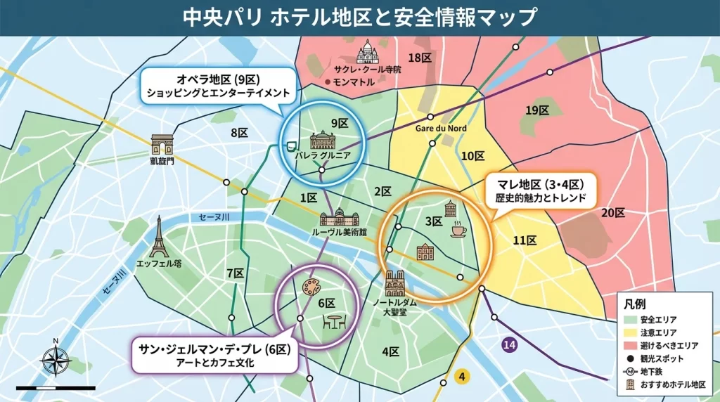 パリのホテル選びで最も大切なのは、「どのエリアに泊まるか」を最初に決めることです。同じ「パリ市内」でも、エリアが違えば治安も雰囲気もまるで別の街。正しいエリアを選べば、パリ旅行の満足度は格段に上がります。